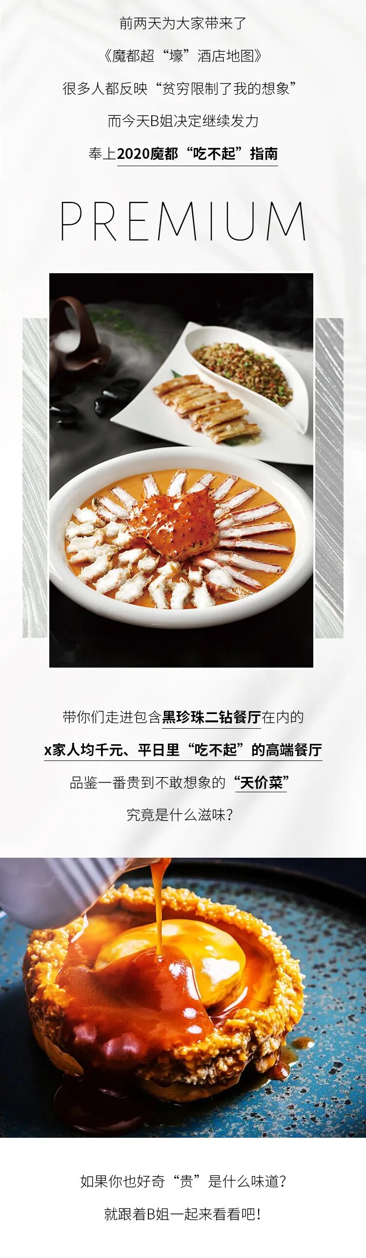 位于外滩十八号的米其林两星「L’ATELIER de Joël Robuchon」作为本次“最贵料理”的压轴选手,带来的全城超贵烤鸡也是相当吸引人。精选1.8kg左右的本地三黄鸡。内脏塞进迷迭香和大蒜等食材,烤制过程中,鸡肉不停转动均匀受热,涂抹黄油,确保鸡肉表皮的水分不流失。配菜是油封土豆和炒香菇以及鸭肝。因为采用的是开放式厨房,所以你可以一边享受美味,一边欣赏厨师烹饪摆盘的全过程。地址:「L’ATELIER de Joël Robuchon」(黄浦区中山东一路18号外滩18号3楼)看完了这些超豪华的美食,有没有感觉到手上的饭菜变得不香了!现在的我们不一定全部吃的起,但总有一天,这些食物肯定会成为我们的“盘中餐”。
