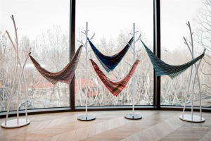 上海展厅的设计巧妙融合了苏格兰自然景观的纹理质感与现代上海的几何美感,打造出一个围绕触感与色彩的优雅空间。