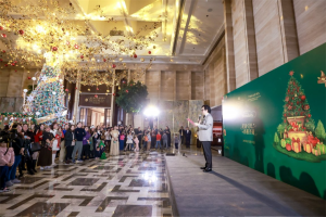 随后,活动进入最激动人心的核心环节——点亮仪式。酒店总经理发表温馨致辞后,酒店管理层与活动策划负责人共同登台,以敲响圣诞铃铛方式,正式宣告上海虹桥机场香格里拉及盛贸酒店的首个圣诞季璀璨启幕。随着铃音清脆回响,大堂中央高达数米的圣诞树瞬间被万千灯光点亮,璀璨光芒映照整个空间,象征着温暖、希望与欢聚的圣诞季正式来临。