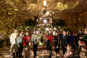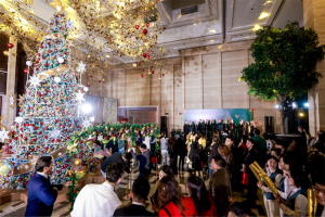 值得一提的是,本次仪式的最独特的设计——装饰灵感来源于从飞机舷窗俯瞰都市的浪漫夜景:地面蔓延的万家灯火,宛如繁星洒落人间。这份空中俯瞰的城市光影,被匠心独运地以“一比一”的构思还原,由知名设计师手工精心点缀,将那些点点星光汇聚成一幅图。中间矗立的这颗圣诞树,不仅是节日的象征,更是一件凝结创意与匠心的艺术之作。树身缀满缤纷彩球与闪耀饰物,缠绕其间的发光饰带如星河垂落,与顶端的璀璨星辉交相呼应,在华美大理石厅堂的映衬下,格外夺目。整棵圣诞树不仅闪烁着节日的璀璨,更仿佛承载了一片自高空凝望的、温柔星夜,让静态的美陈有了动态的诗意与辽阔想象,在酒店空间中构筑出一座“可仰望的空中之城”。