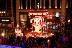 BFC风尚潮流灯区联合泡泡玛特打造潮流年味新体验。2月1日起,泡泡玛特新春游园会空降外滩!BFC北区广场,一座别出心裁的宫灯旋转木马装置瞬间点亮新春夜空:传统宫灯的朱红飞檐下,暖黄灯箱勾勒出12个泡泡玛特经典IP形象,宛如将童话藏入中式画框;下层木马在光影中交织出马年的奔腾意象与喜庆的年节氛围;宫灯一侧,LABUBU的萌趣灯组与旋转木马相映成趣。新春的欢愉蔓延至街区:外滩枫泾路化身为一条璀璨的“国风灯影长廊”,在渐变柔和的灯光下营造出一片可漫步赏灯的诗意氛围;而在BFC上街沿,IP的萌趣世界悄然降临,各式点金奔腾灯组错落分布,将整片街区的烟火气浸润在可爱与温暖的氛围之中,成为新春佳节不可或缺的亮色!
