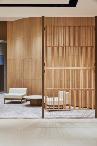 Goldwin全新杭州旗舰店延续了品牌一贯的极简设计风格,店内以自然界经过岁月沉淀的“地层之美”——沉积岩为主材料,融合了品牌长期积累的“知识”,体现出人与自然的平衡关系与对地球生态的敬意。店铺内使用的砂岩材料,利用不同粗细比例的荔枝面工艺处理,呈现出多重自然质感。通过不同区域的组合与展现,达到与自然环境的融合与共存的微妙平衡,营造出一个拥有自然之美的宁静空间,使得消费者可以更加直观的感受到品牌理念的象征性的表现,展现出品牌独有的“极简日式美学”。
