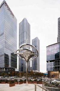 在陆悦天地的入口处,艺术家王光旺的大型装置作品《时光之迹》亭亭而立。这枚优雅的陀螺天体,仿佛时间之轮缓缓展开,其表面映照出周围的景物,又在反射的时空中将其汇聚。