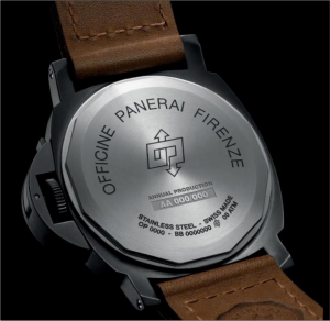 表壳:DLC涂层精钢表壳及表圈,直径44毫米。旋入式封闭表背, 刻有Officine Panerai字样、OP标志和编号信息。