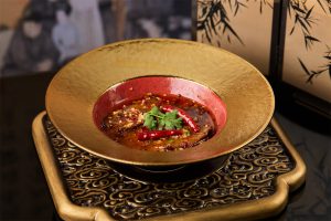 菜品诠释:川菜二十四味之“麻辣味”。油淋雪花牛肉,严选肌理细腻的雪花牛肉,以精准火候汆至柔嫩,置于青翠时蔬之上。精髓尽在最后一刻——汉源贡椒的凛冽麻香与刀口海椒的焦香煳辣覆于其上,一勺滚油如项庄之剑,凌厉泼下,“刺啦”一声,瞬间激发出辛香热浪,恰似鸿门宴上的惊澜暗涌。入口但觉肉质鲜嫩,麻、辣、鲜、香诸味迸发,一口之间,仿佛品尝到历史关头那场宴饮的紧张刺激与命运的千钧一发。
