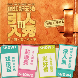 瑞虹新天地于2025年10月25日至2026年1月3日,举办第三届“引人入秀”表演艺术节。本届表演艺术节将延续 “戏很足”、“超敢秀”、“剧好看”、“浓人趴”主题内容板块,别在太阳宫5楼“太阳剧场”与月亮湾1楼“尽兴秀场”两大创意场域展开,同时全面升级内容与体验,集结25家知名剧团及社群,呈现超50场免费演出与互动活动,形式涵盖传统曲艺、当代戏剧、绘本舞剧、玩偶乐剧、歌舞公演等,打造更具规模与创意的全民表演艺术狂欢盛会。