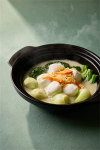 这道菜承袭顺德古法,以“手打”工艺呈现“化鱼为腐”的匠心。严选深海大黄鱼,手工捶打成蓉,反复摔打至蓬松如云,在精准油温中炸至外表微皱、内里洁白。鱼腐如海绵般饱吸清甜鱼汤与当季时蔬的精华,入口即化。与鲜黄耳、广东菜心、西兰花、上海青同锅慢煨,汤醇、菜甜、腐鲜,一锅尽享山海之润、家常之暖。