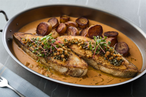 味增腌制帝王鲑鱼以脆山柑、腌制小干葱与味增酱提味,搭配三文鱼籽,鲜香交汇;碳烤比目鱼搭配自制龙虾汁茏蒿草酱与格勒诺布尔酱,凸显食材本味的同时,细腻中不失浓郁。