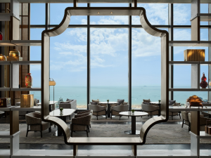 入口庭院中,著名艺术家任天进创作的白铜胡杨雕塑《千年》静立,以不朽材质凝铸时间力量,为空间注入坚韧而沉静的精神意象。穿庭而入,一座名为《启云》的当代艺术雕塑便映入眼帘,由著名雕塑大师隋建国创作,借现代材质与科技语言解构道家“有无相生”的哲思,生命痕迹隐于造型肌理,静立迎候八方来宾。首层抵达大堂萃取 “海上第一名山” 崂山灵韵,化作府邸专属玄关,宾客在此稍作休憩,便可乘梯直上 51 层空中大堂。登梯而至的雅境中,顶天立地的博古架巧借苏式框景之法,将海天一色收作流动画卷,亭榭形制的玻璃屏风疏朗有致,铜色旋转楼梯如飞龙踏云蜿蜒,传统意象经当代手法焕新。市花耐冬、海洋纹样等本土元素不着痕迹地融入动线。前一秒是海韵入怀的恢宏,转角便遇艺术长廊的典雅,真正实现 “一步一景,步移景异”,于方寸之间尽览东方美学的万千气象。
