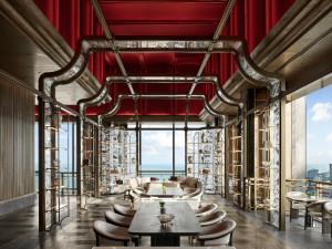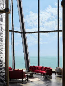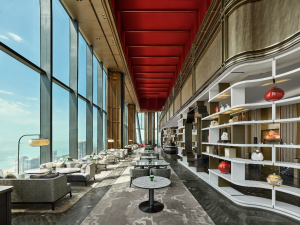 作为青岛上实中心的点睛之笔,酒店所处的双子塔楼由国际知名建筑事务所KPF执笔设计,设计灵感溯源青岛 “山海城” 的独特文脉与 “山海云” 的空灵意境。201.8米的建筑以“珍宝盒”为设计概念,挺拔形态如多个宝盒叠合,寓意丰盈与吉祥。塔楼顶部的通透区域以全景落地玻璃勾勒无界视野,宛如悬于高空的“空中会客厅”—— 它轻拢山海,将崂山的青黛与黄海的浩渺框成一幅流动画卷。于此,既可俯瞰都市烟火,亦能仰望天光云影。塔楼外立面造型亦呼应“节节高升”的美好愿景,不仅象征着项目本身与青岛未来的蓬勃向上,更构筑出一座联通世界与青岛的城市门户。