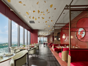 御苑中餐厅位于50层,以“蓬莱仙境”为灵感,金色耐冬花海悬于空中,手工吹制的花瓣轻盈摇曳,营造出仙韵雅致的用餐氛围;九间独立包厢错落于繁花掩映的庭院景致之中。餐厅秉持“珍馐·礼待”的理念,在融合地方饮食文化的同时,注重菜品的地道与精致,致力于为食客打造兼具经典感与仪式感的用餐体验。厨师团队融汇南北风味,匠制专属菜单:甄选时令海产,以精妙火候呈现鲜味本真,细腻之间尽显山海灵韵。御苑八珍以多元菜系技法融汇鲁菜精髓,以海味造境,成就一席风味盛典,呈现纯粹本味的融合佳肴,重释崂山的醇厚与自然底蕴。