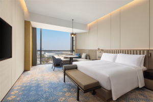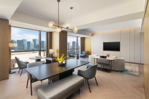绍兴苏宁希尔顿酒店及公寓于设计中深度融入绍兴文化底蕴,将书法艺术的笔墨意趣渗透于空间设计之中,以当代视角重释“文人雅聚”意境。整体氛围宁静雅致,宾客既能于此静思休憩,亦可畅享现代诗意栖居的舒适与便捷。酒店拥有347间配置齐全的现代客房及长住套房,面积从38平方米的舒适客房至271平方米的尊贵套房不等。房内配置蓝牙音响、电动窗帘及智能控光系统,为入住注入从容与便捷。更搭配Crabtree & Evelyn®瑰珀翠高端洗浴备品,于细节处提升入住品质,让每一次下榻都成为愉悦身心的美好体验。