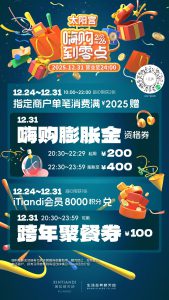 12月24日至31日期间推出消费满额赠及会员积分兑最高价值400元的 “嗨购膨胀金”资格券和100元“跨年聚餐券”,用于跨年夜当晚使用,同时当天还有“跨年大礼盒”限量赠送。并配套太阳宫22:00-次日2:00免费停车,与打车补贴,贴心保障夜间无忧出行。