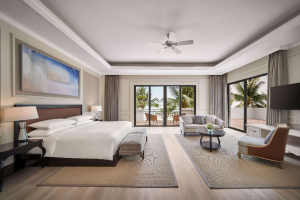 富国岛的原始自然之美在喜来登富国岛长滩度假酒店全新翻修的客房中得以充分展现。所有面向大海的客房、套房和别墅均已升级,采用清新舒缓的色调,为宾客营造放松与解压的理想氛围。无论是客房还是别墅,均精心挑选了独特的家具与装饰品,营造出宁静与归属感。白天,自然光洒满室内,窗外是框景般闪耀的海景,浅色木地板、厚实的奶油色地毯与鸽灰色墙面共同打造出和谐现代的视觉效果。同时,遮光窗帘确保宾客享有不被打扰的优质睡眠。