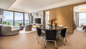 图三:西岸中环汇双卧室尊尚府邸,室内空间开阔通透,大幅玻璃窗将江景自然引入室内。开放式厨房与客厅、餐厅相连,延伸至景观露台,形成流畅的生活动线。空间内配备智能家居系统,提供舒适的现代居住体验。