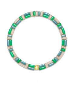 步入此主题展区,仿若亲临PIAGET伯爵位于瑞士仙子坡的高级工坊。空间营造出专注而崇高的工艺殿堂氛围,展现了品牌在金工艺术的精髓与镶嵌技艺的巅峰之上所打造的多件代表性杰作。特别呈现的Curved Artistry弧光艺境主题项链,以八角形切割黄色蓝宝石为主石,搭配陨硫铁与绿玉髓等非凡材质,在圆弧造型与多元材质的交相辉映中,展现品牌对色彩与形态的大胆探索。同场亮相的Arty Pop流行艺术主题高级珠宝坠饰时计,以明快的绿色宝石与看似随性的构图诠释波普艺术(Pop Art)的叛逆精神。作品通过多样切割钻石与孔雀石、绿玉髓的精妙镶嵌,在跃动形态中构筑起精密的视觉层次,淋漓演绎PIAGET伯爵不拘一格的美学语言与卓绝匠艺。