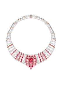 展区溯源PIAGET伯爵历史上最具突破性的创作之一——于1969年问世的“21世纪系列”。该系列以其前所未有的设计语言,打破珠宝与腕表的界限,重新定义了高级珠宝的佩戴方式。如今,参观者不仅能在此欣赏到“Shapes of Extraleganza奢雅之形”系列的全新力作,还能一览“Essence of Extraleganza奢雅之源”系列的精妙设计与承袭自“21世纪系列”设计的标志性高级珠宝坠饰时计。其中最引人瞩目的莫过于两件绽放耀目华彩的高级珠宝主题作品:Wave Illusion光影幻彩主题作品以珍稀迷人的红色和橙粉色尖晶石与钻石之间的层叠镶嵌,打造出如波浪般起伏的视觉幻象,流转出动态的光影韵律;而Gleaming Shapes溢彩之形主题作品以三角与方形交错组合的震撼构图致敬索特萨斯(Ettore Sottsass)对多元形态的精湛驾驭,将基础几何元素转化为蕴含动态张力与表现力的艺术载体。两件作品皆以当代技艺续写跨越时代的创意叙事,淋漓尽致地诠释PIAGET伯爵灵魂中优雅与不羁的共生本质。